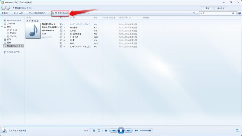 選択出来たら上部メニューの「CDの取り込み」をクリック、