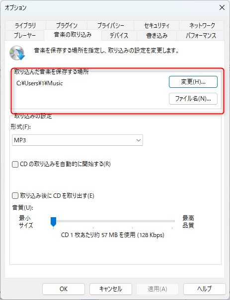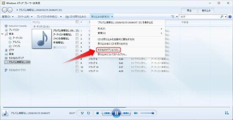保存するフォルダを変更したい場合は、メディアプレイヤーの上部メニューにある「取り込みの設定」をクリックしプルダウンメニューから「その他のオプション」を選択、
