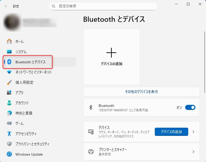 Windowsの設定「Bluetoothとデバイス」をクリック、