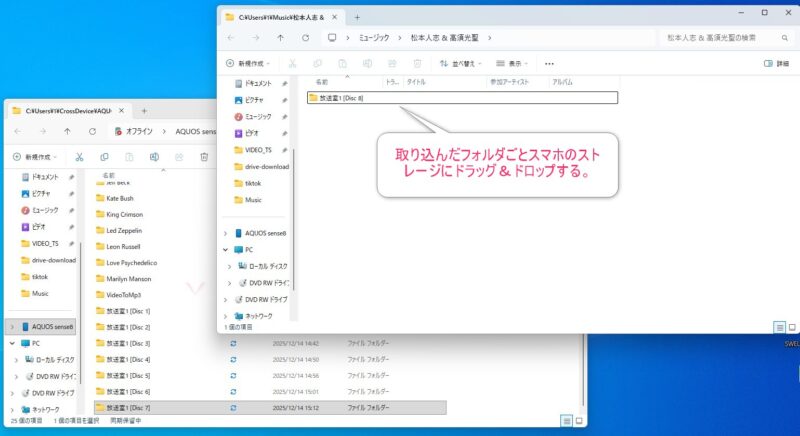 このMusicフォルダに、先ほどPCに保存した音源ファイル(フォルダ)をドラッグ&ドロップするだけです。
