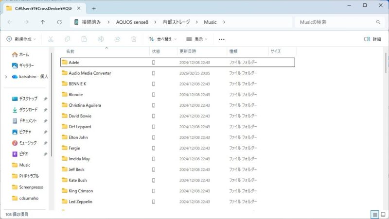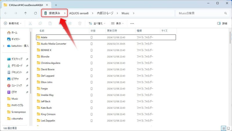無事スマホを接続出来たら、スマホのストレージにあるMusicフォルダを開きます。