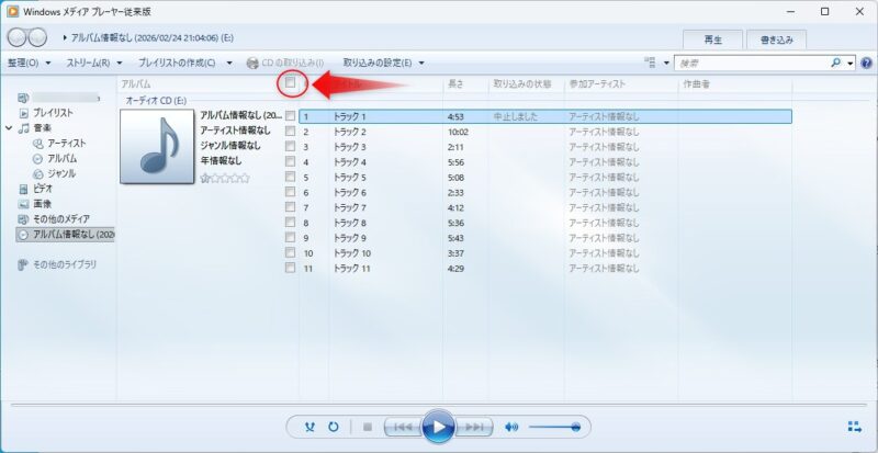 メディアプレイヤー(従来版)を立ち上げたら、収録曲すべてを選択します。