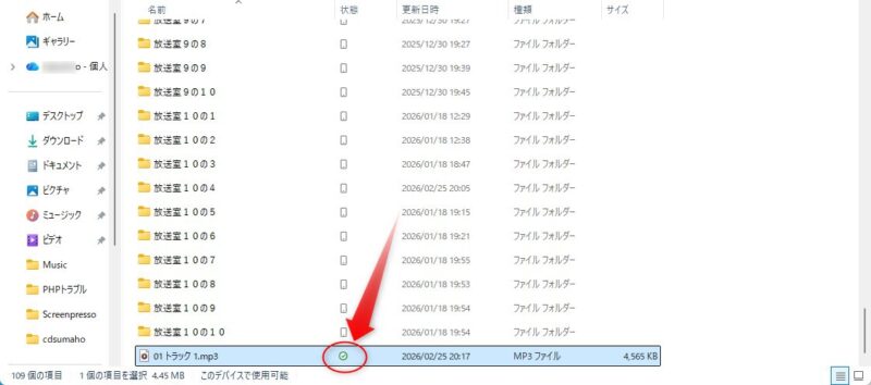 上図の矢印部分には、音源ファイルのコピー状態が表示されます。上図の場合「が表示されていて、無事コピーできたことを表していますが、ここにサークルボタン「出ているとコピーできていません。