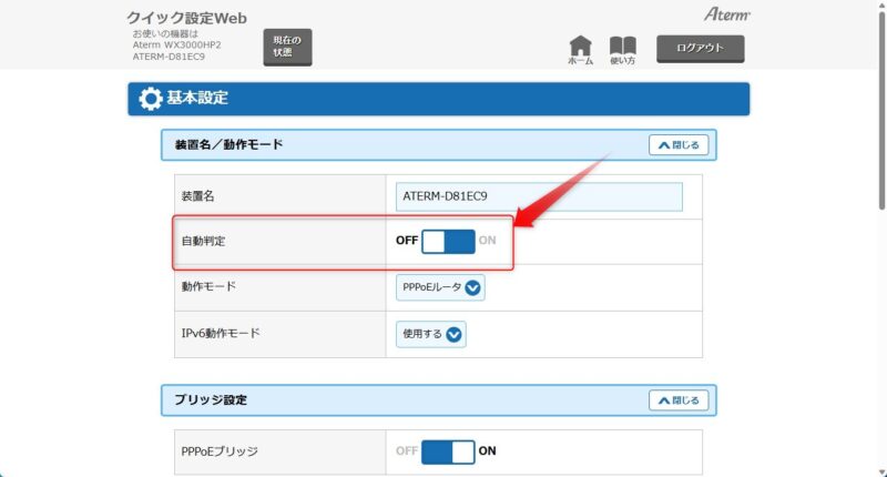 と書かれています。調べてみると、この自動判定機能がかえって回線を不安定にする原因となることがあるとありましたので、今回OFFにしてみました。