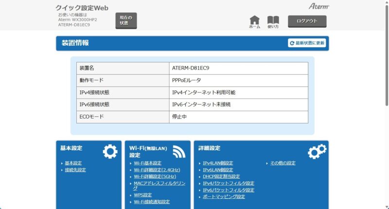 Atermの場合クイック設定webにアクセスします。ログインするとトップページが表示されます。