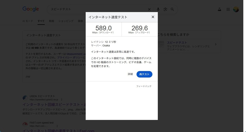 ここでわかるのは計測時点での回線速度とレイテンシ(Ping値)です、回線の安定度までは推し量れません。