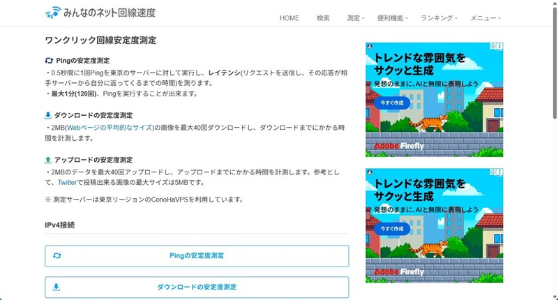 このサイトにアクセスすると、Pingやダウンロードなどの安定度がわかります。