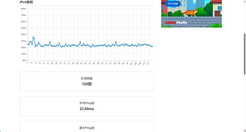 上図は1分間のPingの応答速度を測ったグラフです。平均が23.94msで比較的安定しているのがわかります。