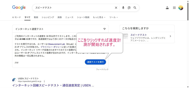 Googleの検索窓に「スピードテスト」と打ち込み、一番上に出てくる「インターネット速度テスト」の速度テストを実行ボタンを押せばすぐに回線速度を計測してくれます。